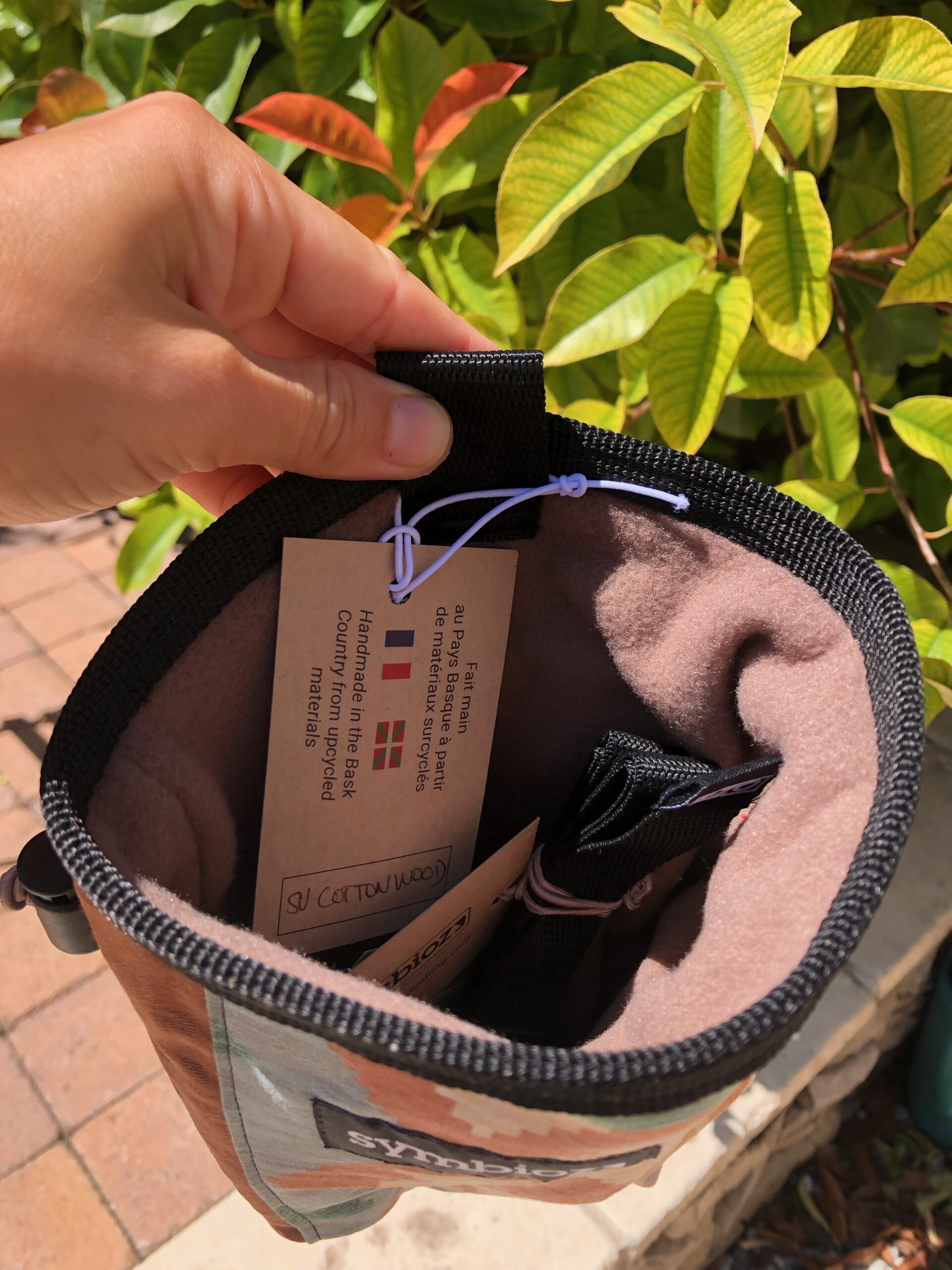 De plus, les produits proposés sont pour tous les goûts, chaque modèle est unique et cela apporte un intérêt supérieur au produit. Quel plaisir de porter un produit unique ! Personnellement, nous avons opté pour celui-ci, son tissu est joli et agréable, et sur le côté, il y a un support pour la brosse à magnésie.